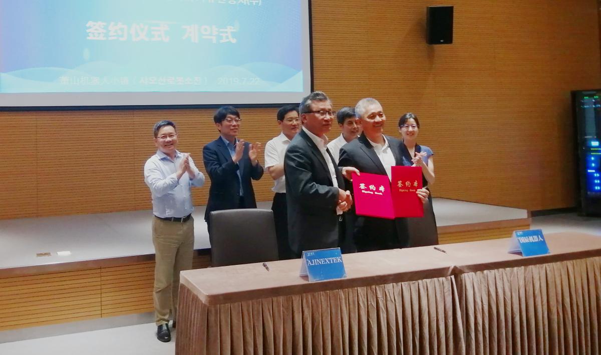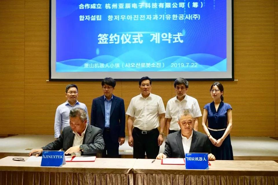 【國辰訊】2019年7月22日,杭州國辰機(jī)器人科技有限公司與韓國(株)亞進(jìn)EXTEK合作成立合資公司簽約儀式在蕭山機(jī)器人小鎮(zhèn)隆重舉行。蕭山經(jīng)濟(jì)技術(shù)開發(fā)區(qū)黨工委委員、管委會(huì)副主任徐建中,開發(fā)區(qū)招商局副局長、機(jī)器人小鎮(zhèn)工作組負(fù)責(zé)人陳笑,浙江省機(jī)器人產(chǎn)業(yè)發(fā)展協(xié)會(huì)秘書長王國耀,韓國大慶機(jī)器人振興社會(huì)長金昌浩,杭州國辰機(jī)器人科技有限公司首席戰(zhàn)略官王國成、韓國(株)亞進(jìn)EXTEK常務(wù)崔成赫等出席簽約儀式。