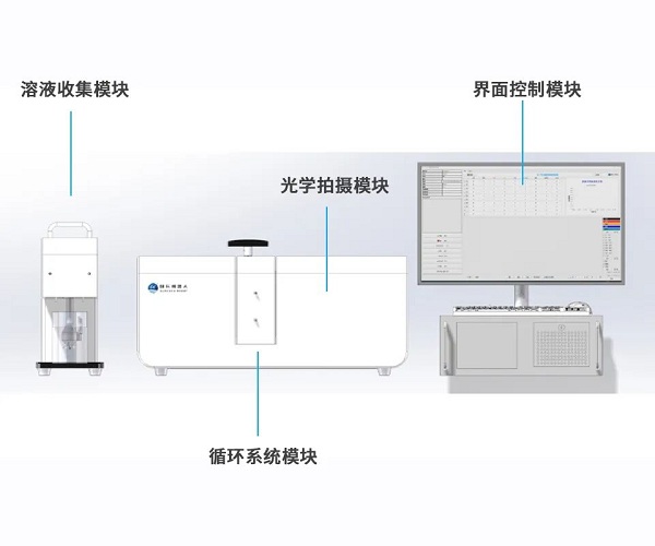濕法粉末雜質(zhì)分析儀主要包括以下部分:界面控制模塊、光學(xué)拍攝模塊、循環(huán)系統(tǒng)模塊和溶液收集模塊。