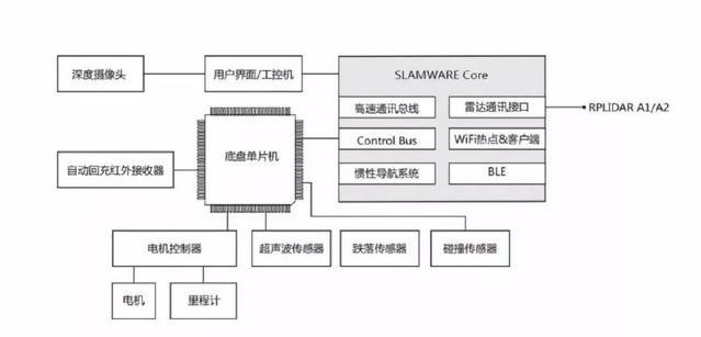 內部結構中,主要由激光雷達傳感器、深度攝像頭、超聲波及防跌落傳感器,模塊化定位導航系統SLAMWARE、等核心硬件組成。使其擁有可靠、易用的自主定位導航解決方案,多傳感器融合配合導航算法,能更靈活的規(guī)劃機器人行走路線。